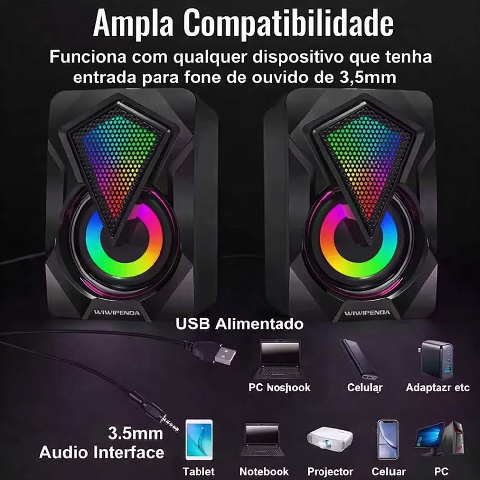 Compacta e funcional, conta com alimentação via USB e conexão P2 3.5mm, oferecendo compatibilidade com diversos dispositivos sem necessidade de instalação.
