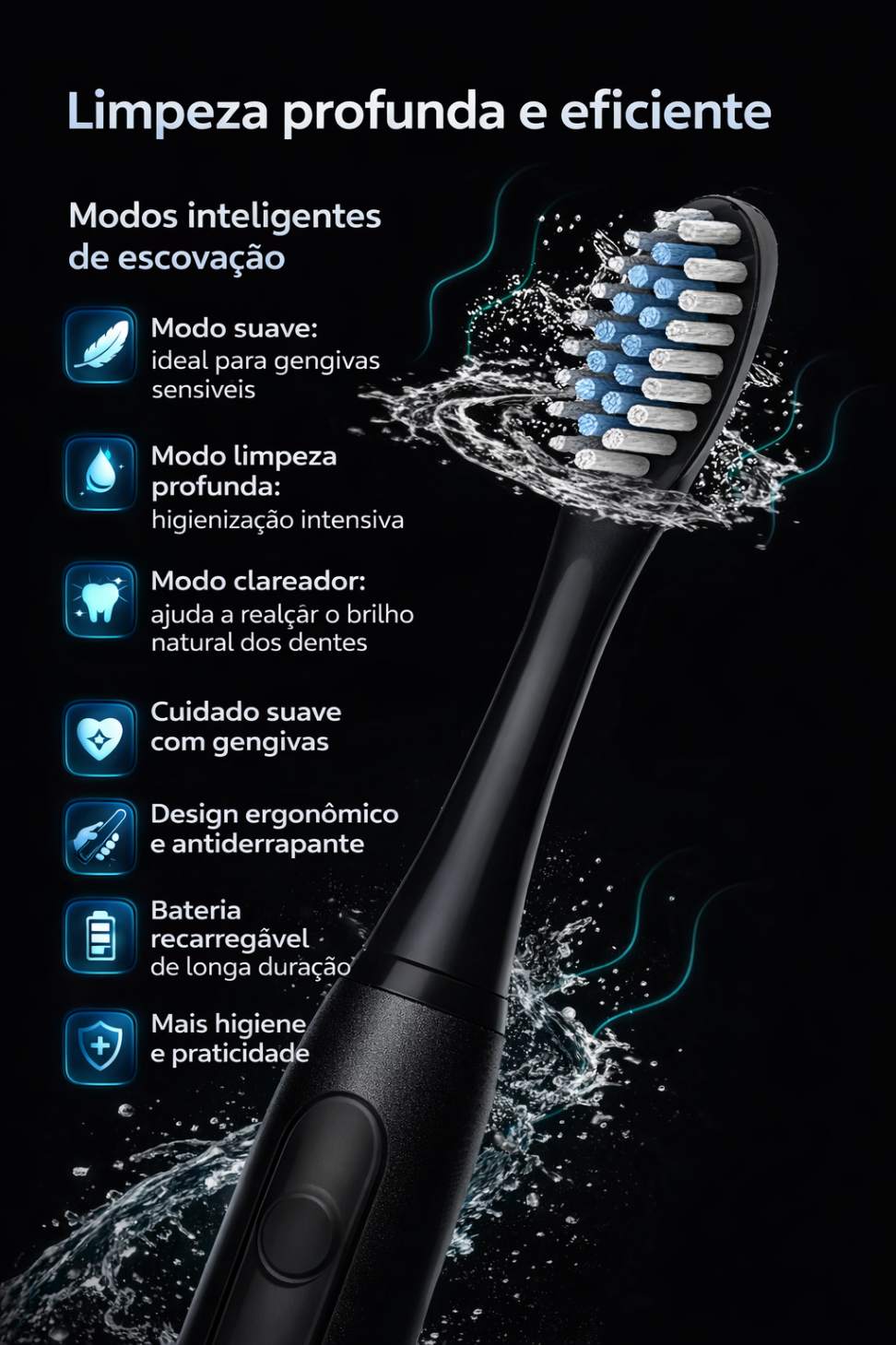 Eleve o seu cuidado bucal com uma escova de dentes elétrica desenvolvida para oferecer limpeza profunda, conforto e praticidade no dia a dia. Ideal para quem busca dentes mais limpos, saudáveis e um sorriso visivelmente mais brilhante.