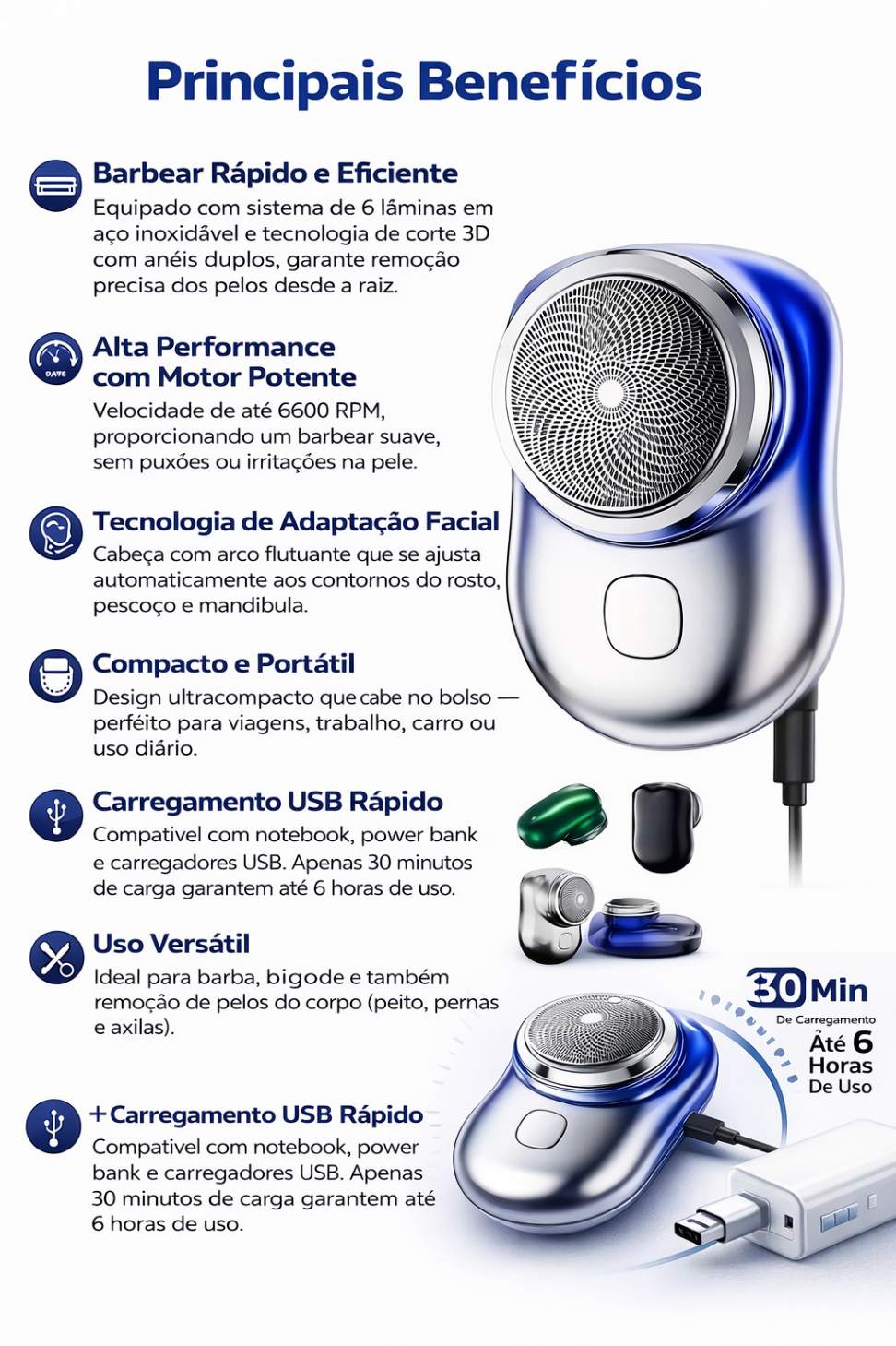 O Mini Barbeador Elétrico Portátil é a solução ideal para homens que buscam praticidade, desempenho e mobilidade no dia a dia. Compacto e eficiente, ele proporciona um barbear rente, rápido e confortável em qualquer lugar.