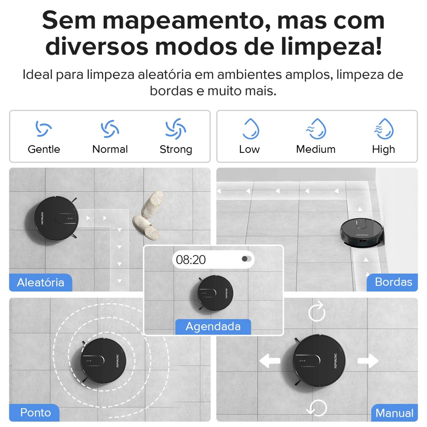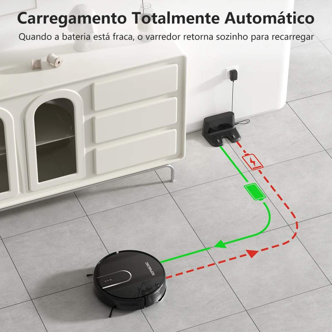 O robô conta com 3 níveis de sucção ajustáveis e 4 modos de limpeza, adaptando-se facilmente a diferentes ambientes e níveis de sujeira. Sua rota de limpeza inteligente tipo aleatória garante cobertura eficiente do espaço.