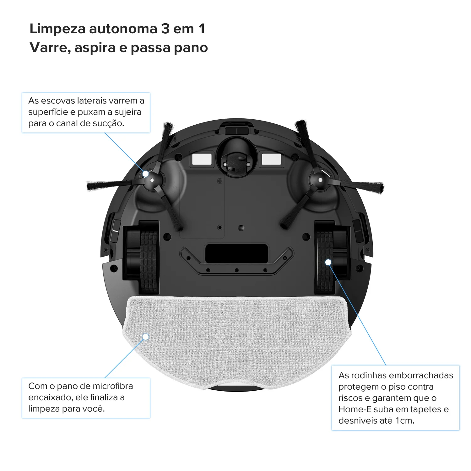 - Limpeza 3 em 1: aspira, varre e passa pano ao mesmo tempo